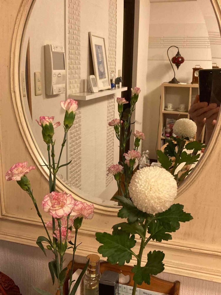 2021.10.6 今日は義父の二十三回忌。祥月命日です。カーネーションとピンポンマムを妻が買ってきました。仏花ではなく、季節ごとに気に入った花を供えています。