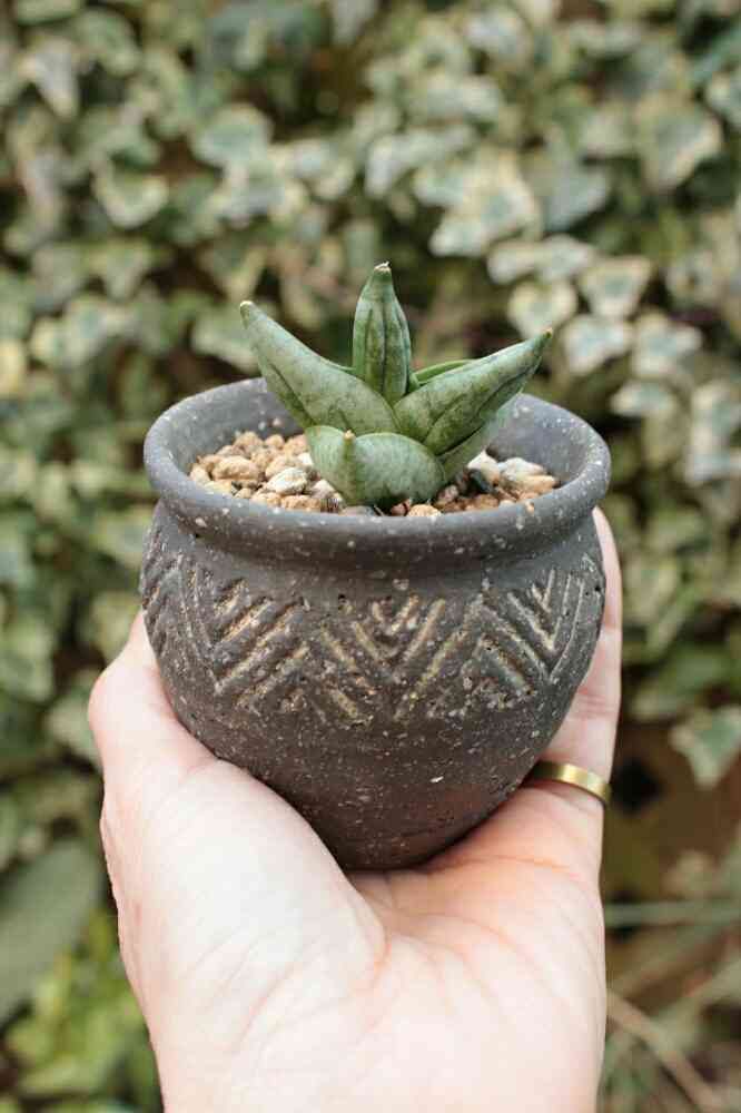 このつぼ型🍯の鉢と模様も渋くて、サンスベリアのむちむちさが際立って好きです🍀