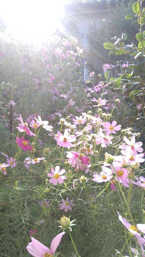 柔らかな朝日に、コスモスがふんわりと、綺麗~🎶♡