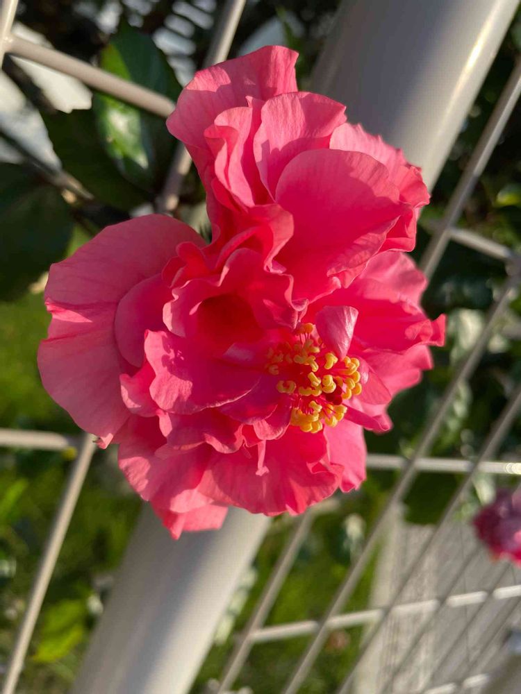 フェンスからひょっこりお顔を出して、咲いている八重咲きのハイビスカスさんが可愛い(⑅ ॣ•͈ᴗ•͈ ॣ)∟ᵒᵛᵉ૫૦∪