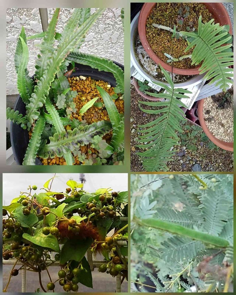 上のふたつは外で育てていている株分けしたノコギリヘラシダと根差しが初めて成功したタイワンアオネカヅラ