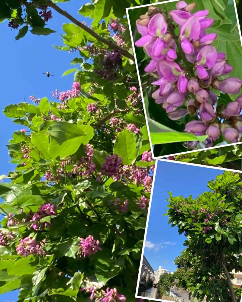高木なので遠目には気付きにくく、葉はマメ科らしくないが、薄紫やピンク色の花が美しい♪