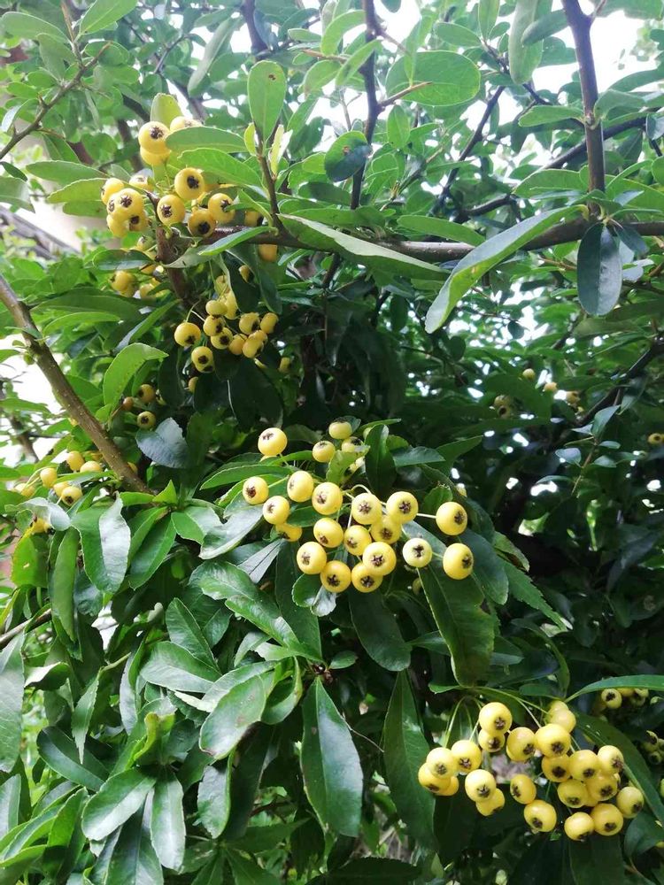 お庭のピラカンサの実が色をつけ始めました。柚子の木と同じでトゲのある木なので剪定の時は手こずります。オレンジ色に変わるのをゆっくり眺めたいです♪