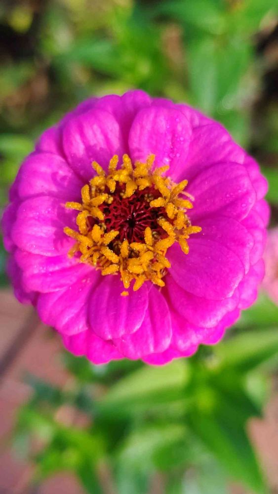 ジニアの蕊に、たくさんの朝露がついていてキレイでした✨