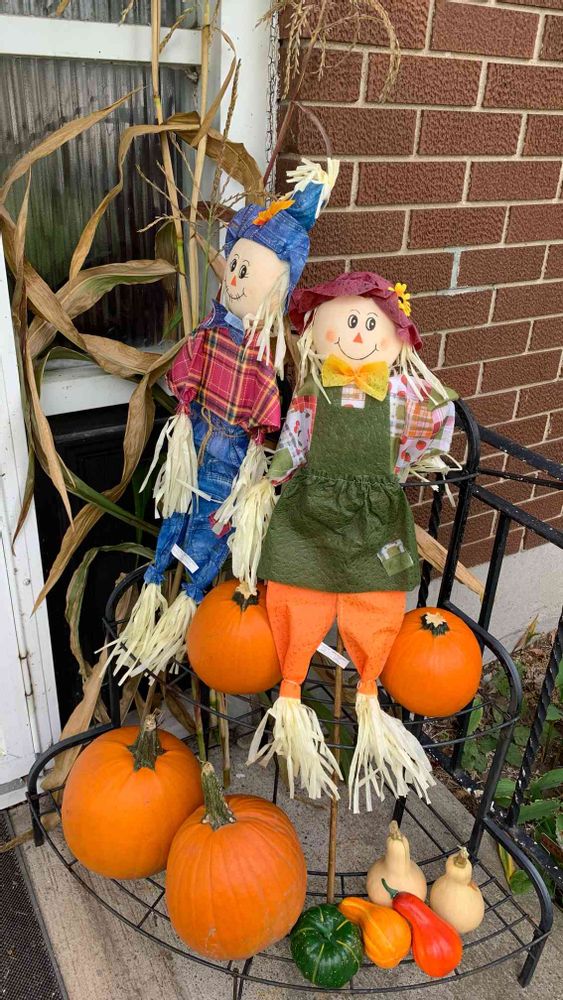 トウモロコシの干し草(?)は息子のものを、パンプキン類は本物偽物取り混ぜて😅