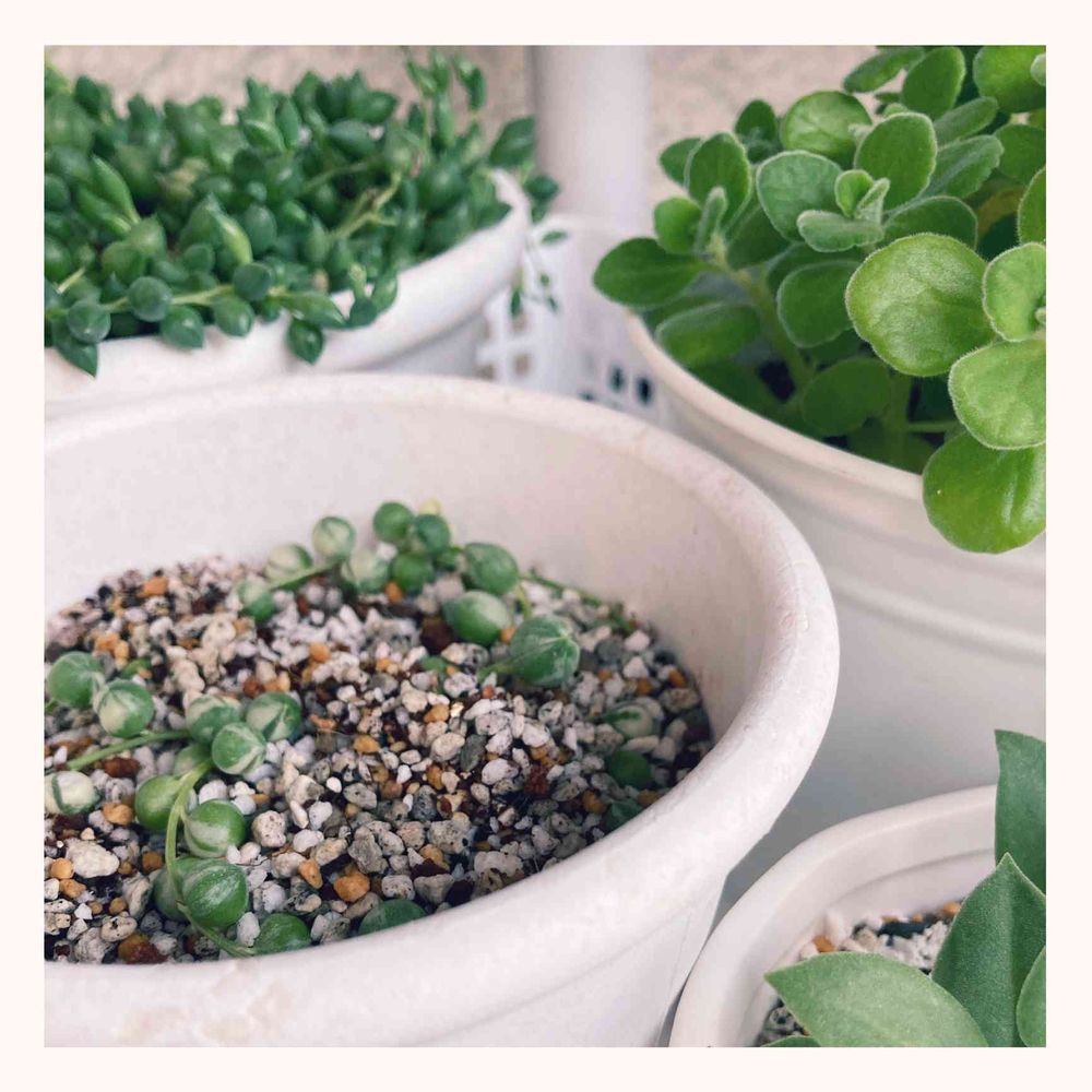挿し穂のマーブルネックレスの葉が真っ白になったので掘り出してみると根がダメになっていたので植え替えたら、元気に新しい葉も付き始めました。分けて頂いた大切な子達。大きく育って欲しいな♡
