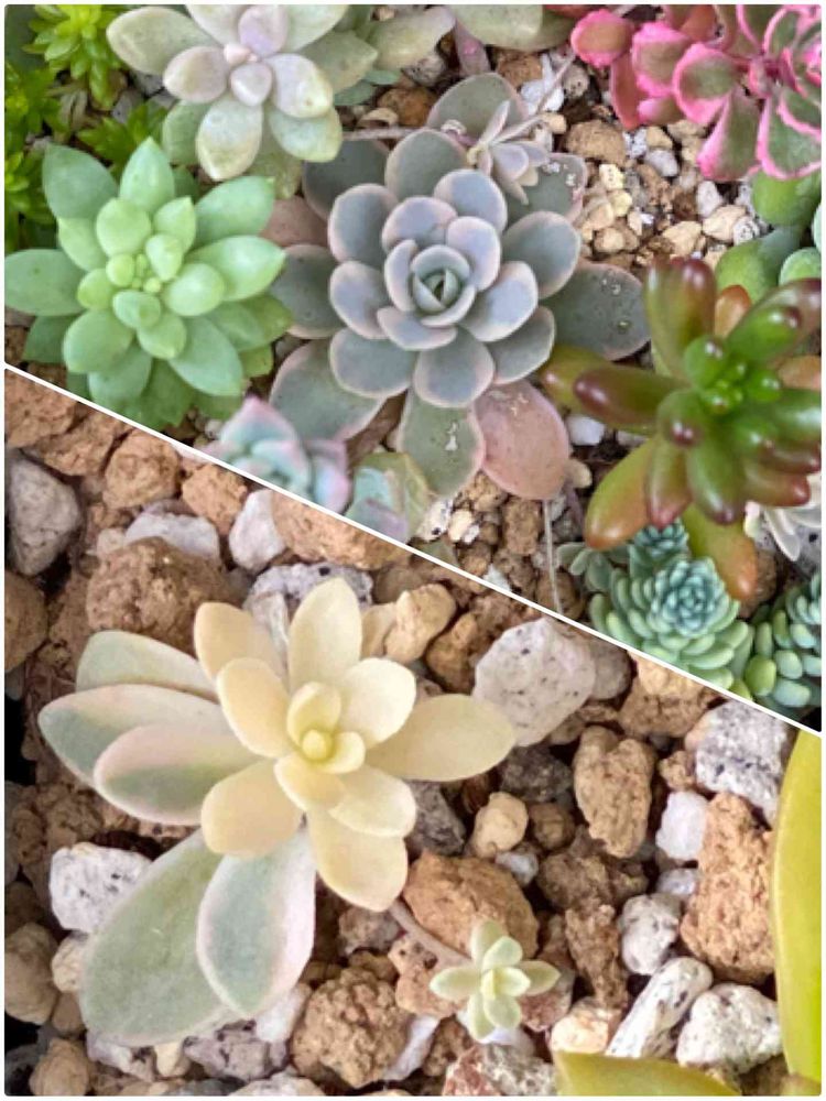 上の子持ち蓮華は「斑入り」だと思いますが、下の子持ち蓮華は「カスタード」という斑入りかなぁって思います。自信ありません😢