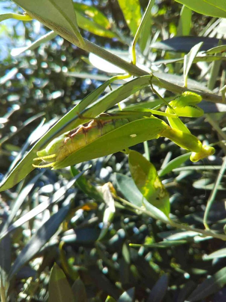 オリーブの木に、お腹がパンパンのカマキリがいました😅
