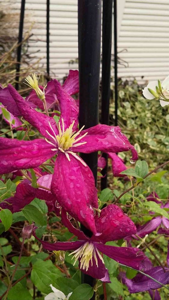風でクレマチスが飛んで駄目かと思い支柱立てたら