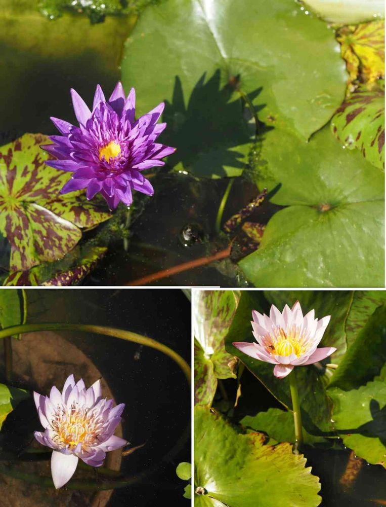 温帯睡蓮ズ(黒姫, タン・クワン, ペリーズ・タブル・イエロー)はもう咲きそうもないが、熱帯睡蓮ズはまだまだ咲く気満々