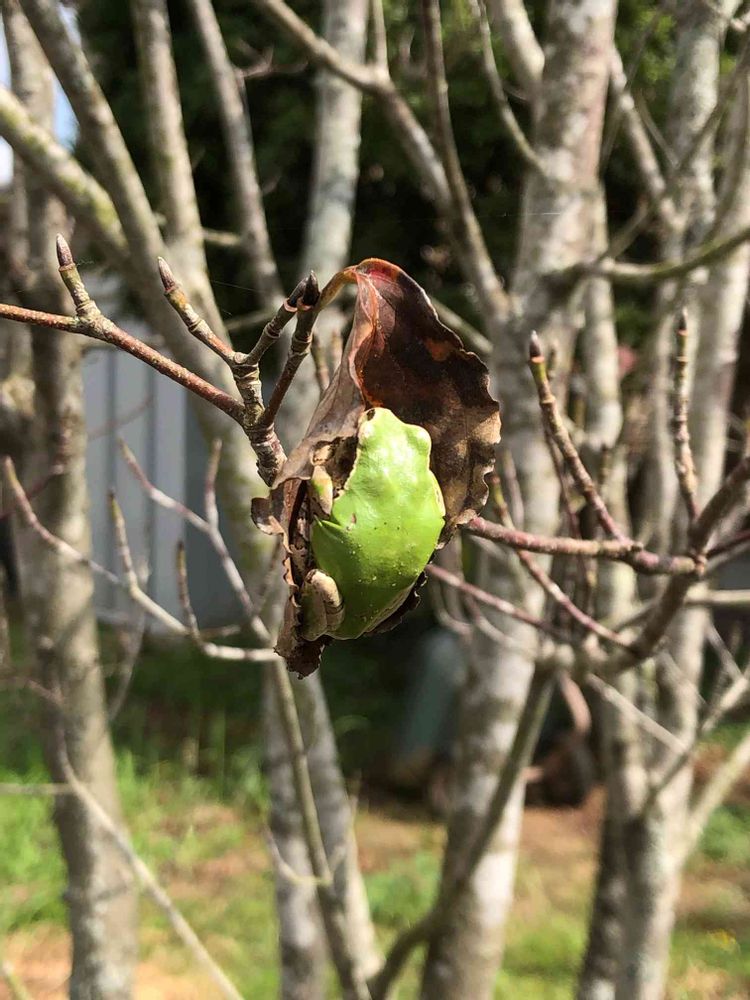 枯れた葉に緑のカエル🐸目立ちすぎる。しかもお腹パンパン。枯れ葉ごと落ちやしないかヒヤヒヤ。重量オーバー?ギリギリセーフ?