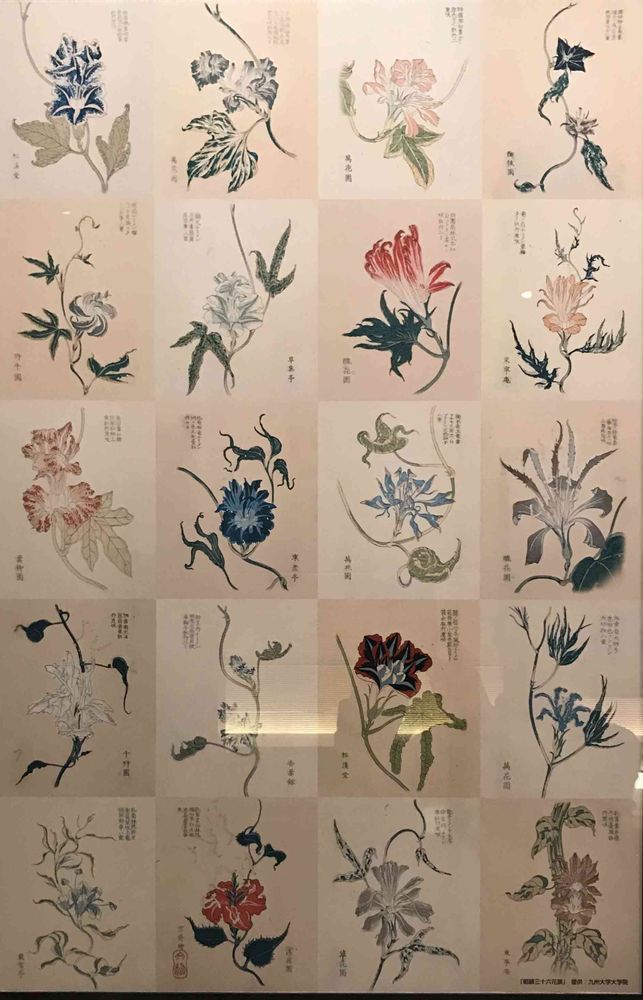 朝顔とは思えない花と葉を有する変化朝顔が幕末に流行しました。本書はアサガオの奇品中の奇品を選んた図譜となります。 冊子の様になっていますが、国立科学博物館の展示は一度に三十六品を見ることが出来ます。