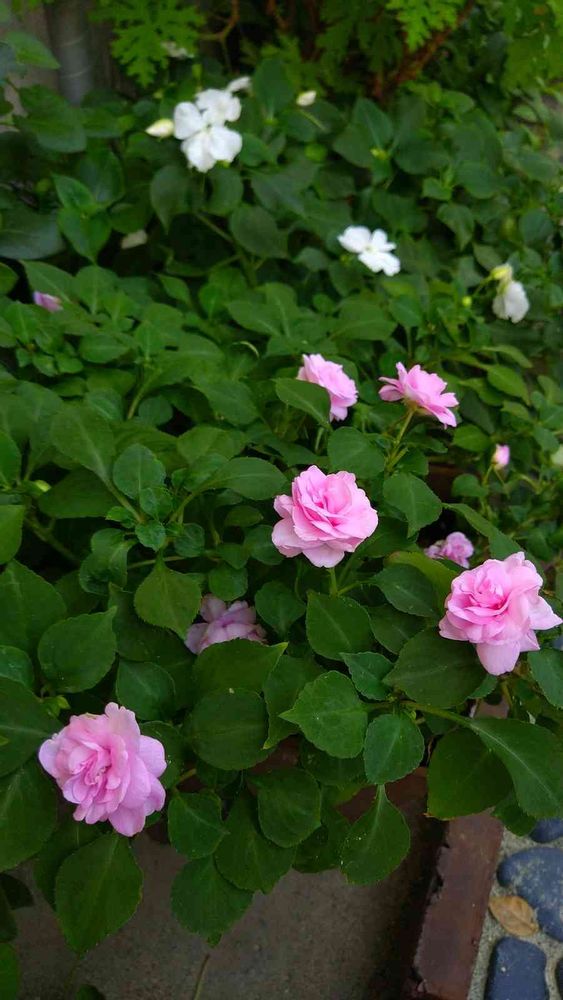 インパチェンス、ピンクと白が並んで素敵!…ホントのびのび気持ちよさそうで、嬉しいわね〜!!☺️❣️