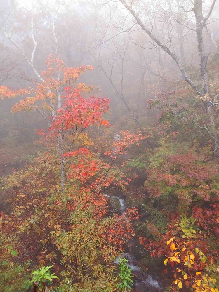 お昼頃です🍁福島の吾妻スカイライン🎶🚗💨🎶途中休憩地点つばくろ谷霧雨☂️の中の景色です🍂