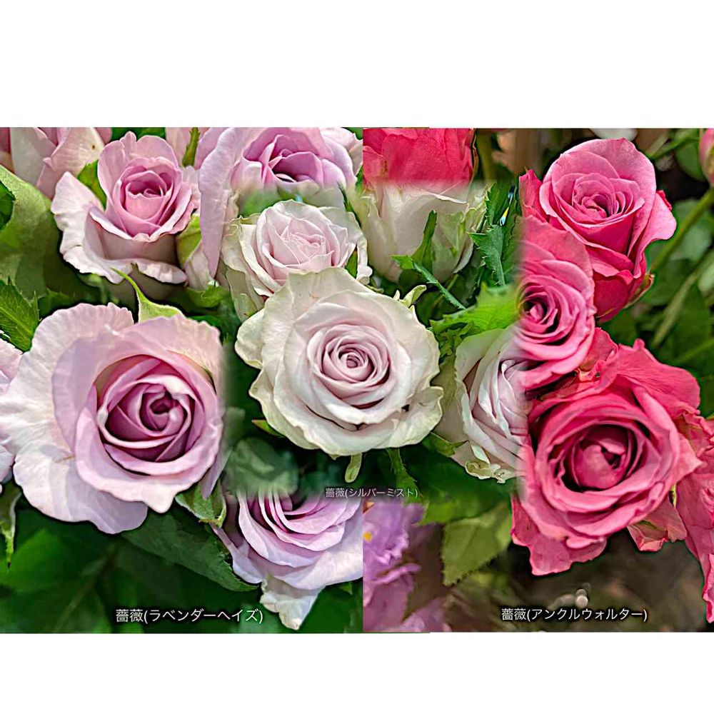 紫系x1、複色(混色)系x1、赤系x1のバラ、3つ。