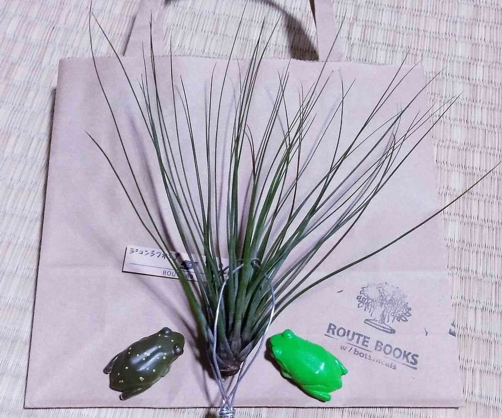 久々のお出かけでお迎えした、チランジア ジュンシフォリア。カエルを添えて。