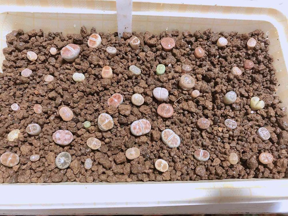 赤ちゃんリトープス、整列し直しして赤玉土で深めに植えて(倒れないように)、水洗いした。