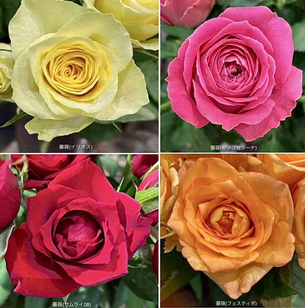 黄系x1、ピンク系x1、赤系x1、橙系x1のバラ、4つ。