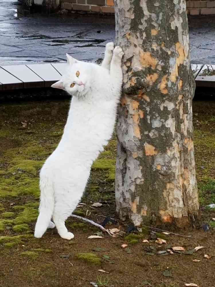 長崎平和公園にて持ちつ持たれつの関係のサルスベリの木と白猫さん_(^^;)ゞ🌼🌿
