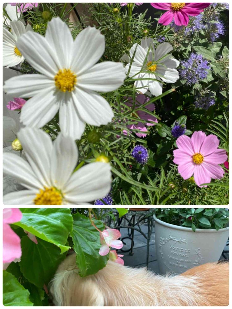 下のベゴニアの横と奥にコスモス🌸が有りますが、ワンコ🐶が異変を察知?
