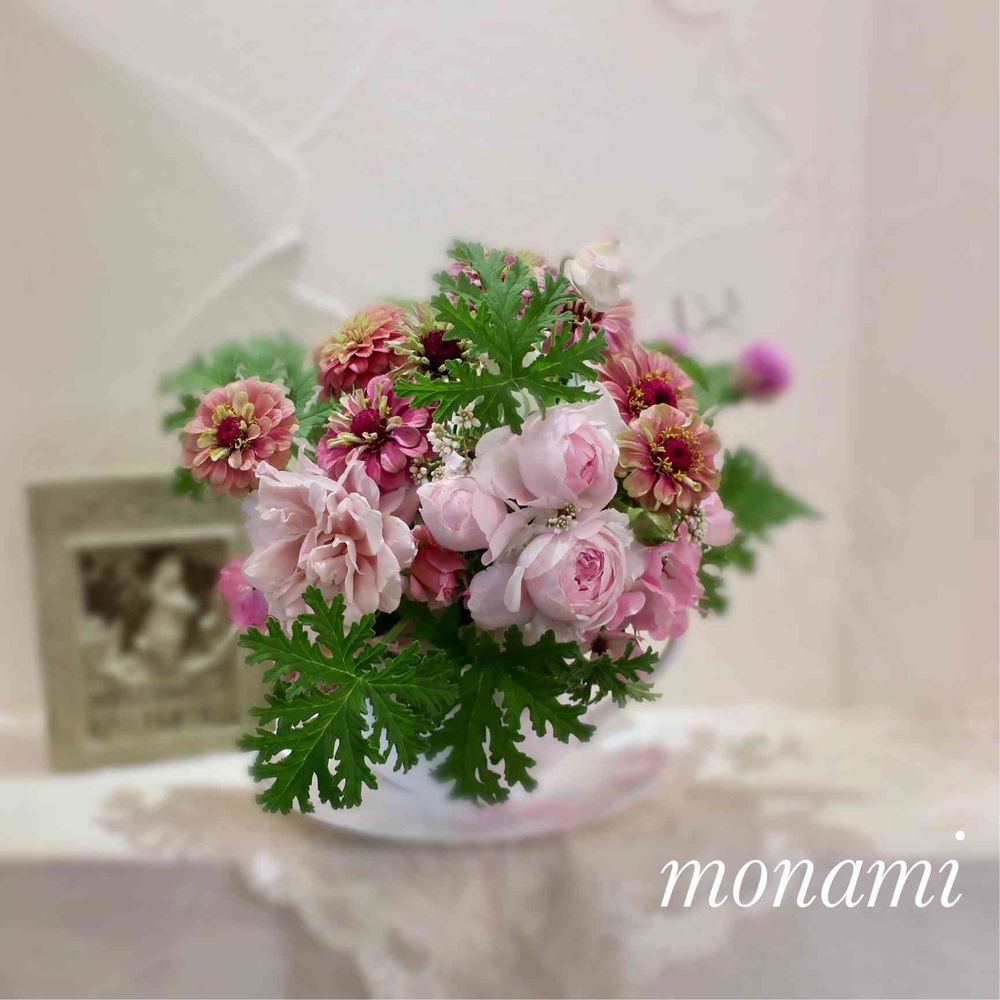今日は可愛いハーブゼラニウムの葉っぱ🌿とバラ🌹ジニア🌼などのアレンジ💐