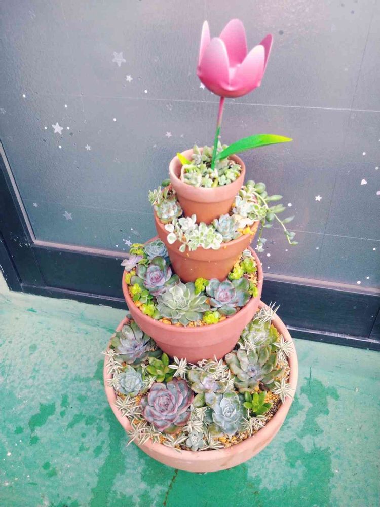 昨日、姉のまねっこをして作った鉢を重ねた寄植え、ヘラクレス盛り💕