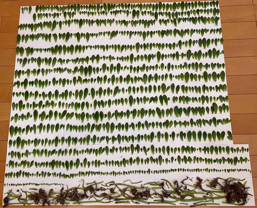 春萌丼の仕立て直しで出てしまった葉っぱと茎。葉挿しといってもこんなに苗ができちゃったら管理にに困るし…。