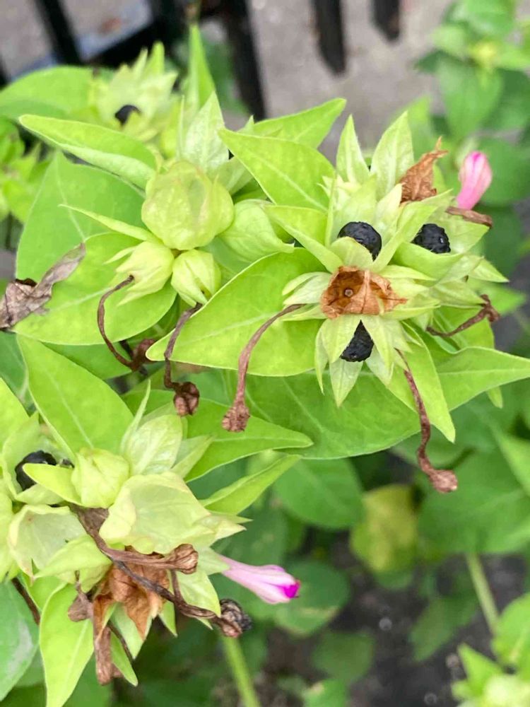 花の後には黒い大きな種ができ、これを潰して 子どもたちがお白いごっこして遊びすることから、オシロイバナと呼ばれるやうになりました。