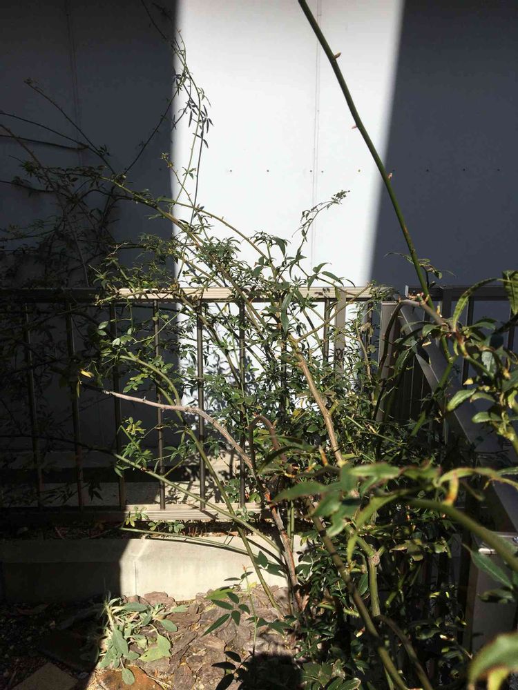 モッコウバラ、✨🌿うちの北東角に2年前植え付けた。白い壁はお隣の倉庫の背中側です。あまりに勢いよく蔓が伸びるので誘引に困っています。北東角ですが、12時ごろはご覧の通り日当たりがよいです。フェンスが低いのでうまく誘引できなくてどうしたものかと👀😅