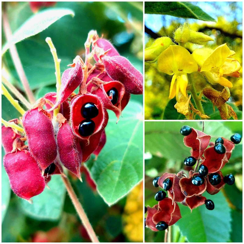 濃い黄色の花と鮮やかな赤い鞘 真っ黒の種が緑の葉に映えて結構目立ちますね🎶