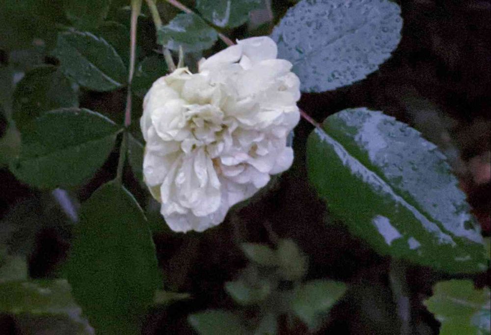 夕方ミニバラが雨に濡れていました。…辺りがもう暗く、白色が浮き上がっていて、きれいでした。