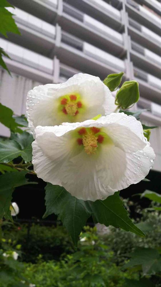 白い芙蓉の花2つ、一方がもう一方をおんぶしているみたい。