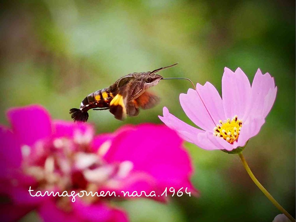 tamagomen. nara.1964さんのヒャクニチソウ(百日草)☻,コスモス(秋桜)☻,ホシホウジャク(星峰雀)☻の投稿画像