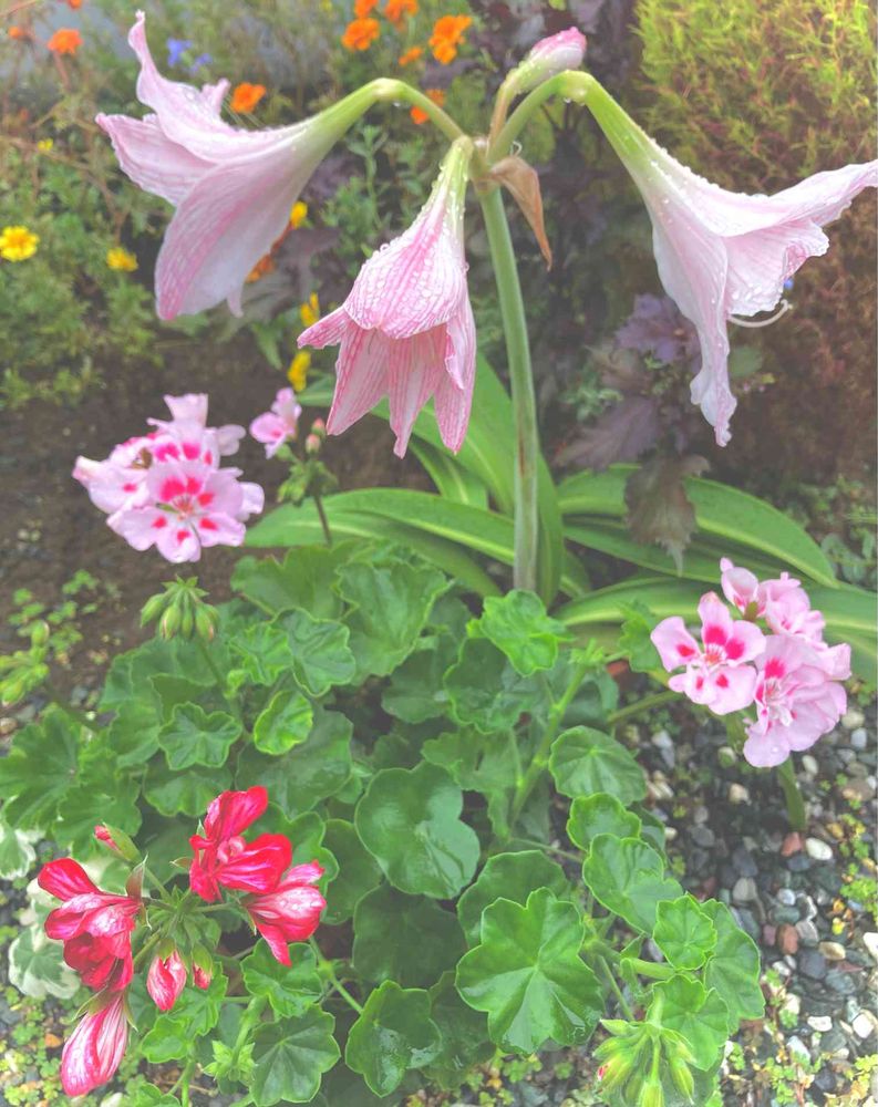 アイビーゼラニウムが他の二本を覆い隠そうとしています