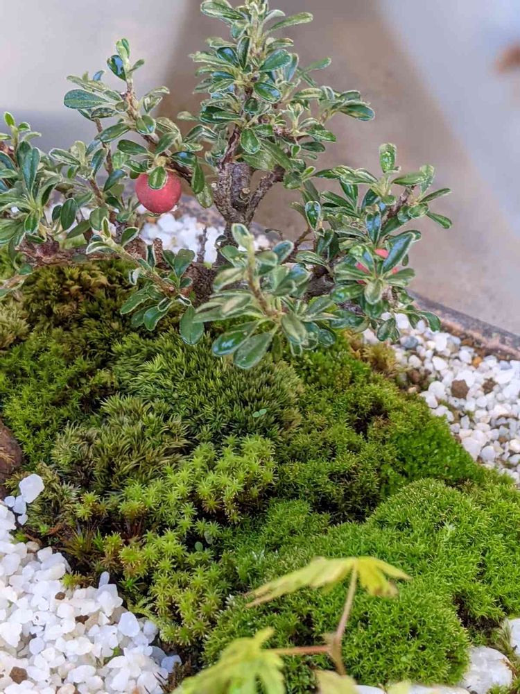 一番最初に作った盆栽🙂白紫檀に赤い実が付きました😆苔も、モフモフです😇
