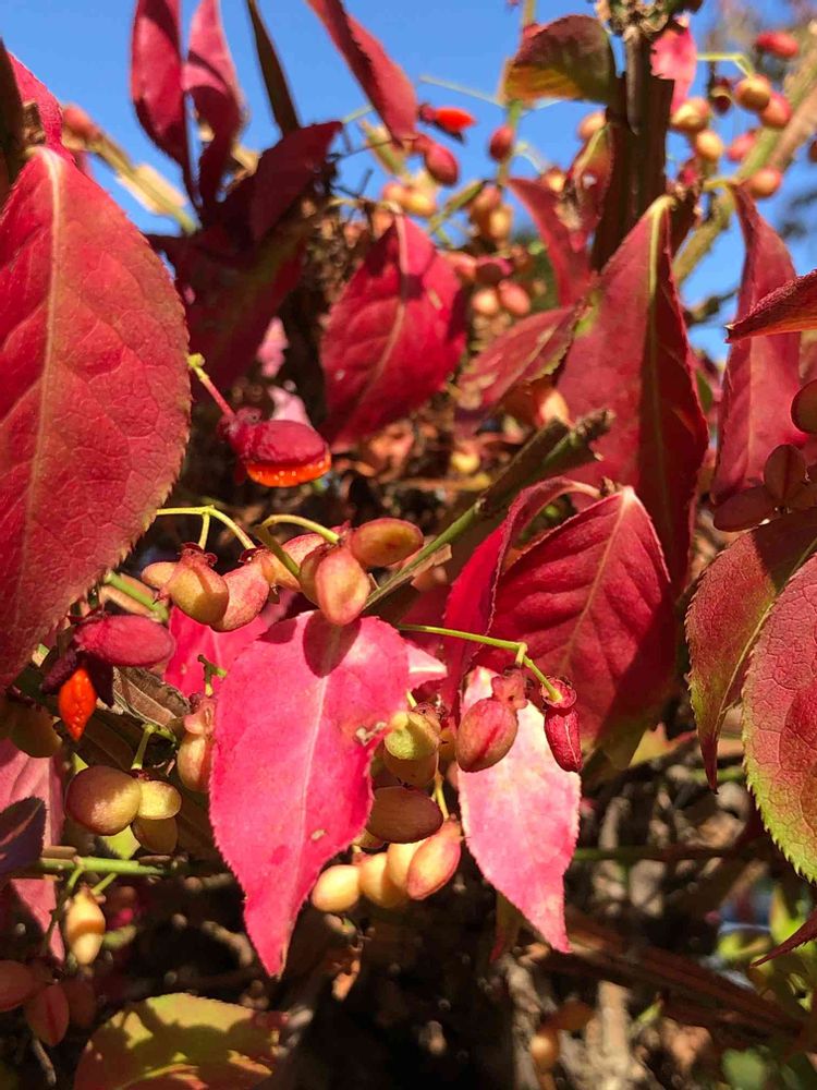 北海道は、まさに錦秋ですね🍁。ニシキギの葉が、錦の織物の如く赤く色づいて、これから赤くなる実も綺麗ですねぇ🤗🍒。