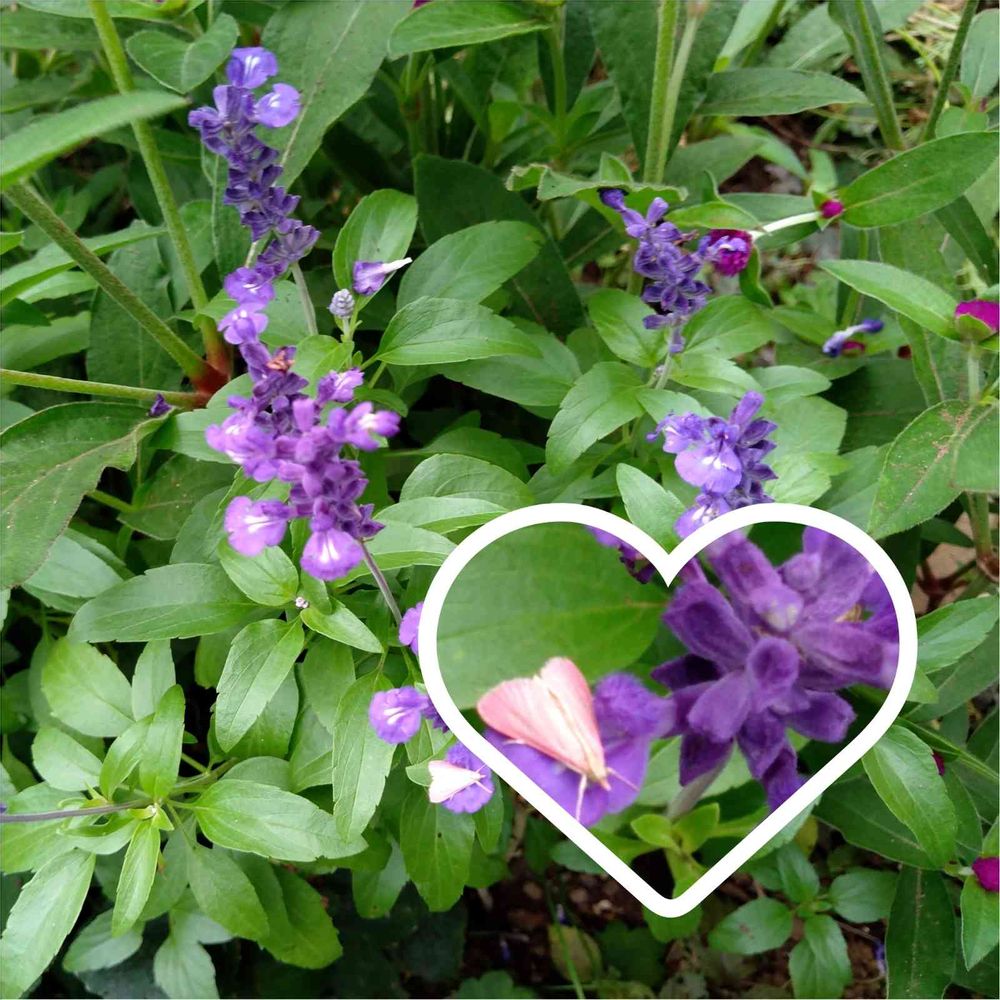 冬越しのブルーサルビアにピンク色の小さな蛾が止まって可愛い