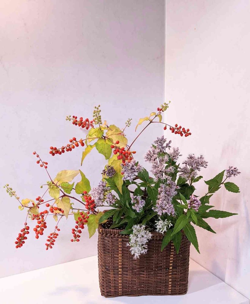 竹籠に生けただけでお庭の花が野趣あふれる秋らしい生け花になりました😊💕