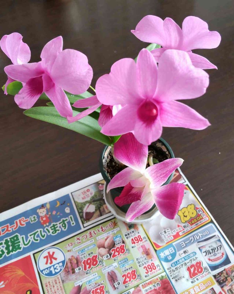 比較の為に足元に置いた普通のデンファレと比べて、華奢で花の大きさは三分の一くらいです