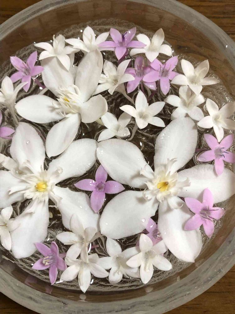 薔薇🌹も蕾だし…切り花ないなぁとおもって 浮き花をテーブルに。。。