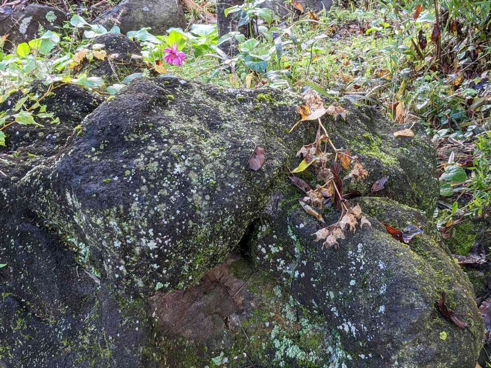 庭の斜面への下り口の左側にこの大きな石があります。ここへ越して来た15年前の当時、何処から持って来た石なのかこんなに苔生していなかったのですが、この15年の我が家の月日を感じさせる石です。
