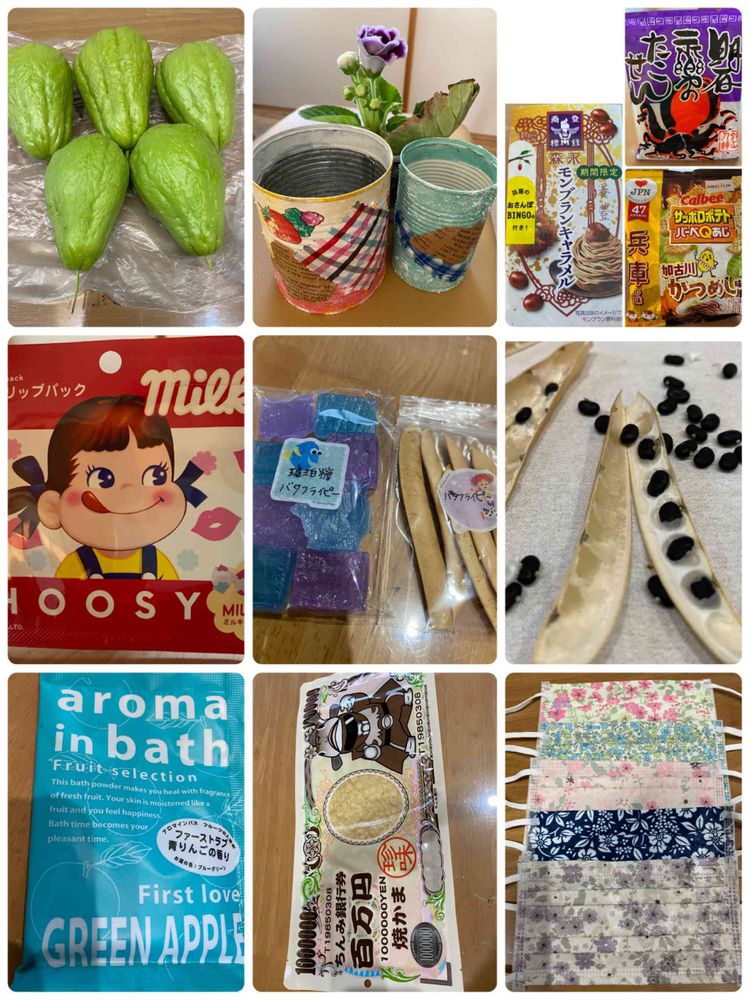 貴重なマスクに唇パック、沢山のお菓子に入浴剤。ハヤトウリは味噌漬けが好きなので、これから漬け込みます。