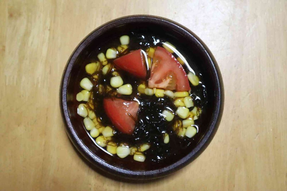 木の器にモズク、健康に美容に、もっと沢山食卓に乗せたいと思いました。