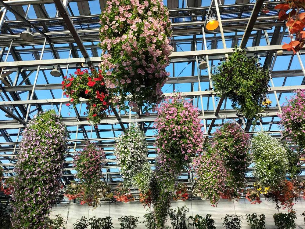 ももいろハートなどのペチュニアが天井からぶら下がっています