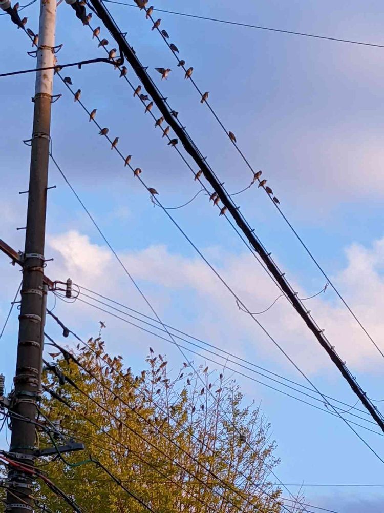 銀杏の樹にとまりきらなかった🦜が電線にとまったのでしょうね。昼間はにぎやかですが夕方に声をきくのは初めでした。(•ө•)♡