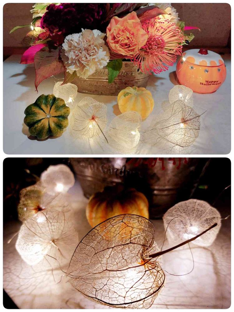 透かしほおづきに100均のイルミネーションを入れて、さらにごちゃごちゃ飾ってみました🧡