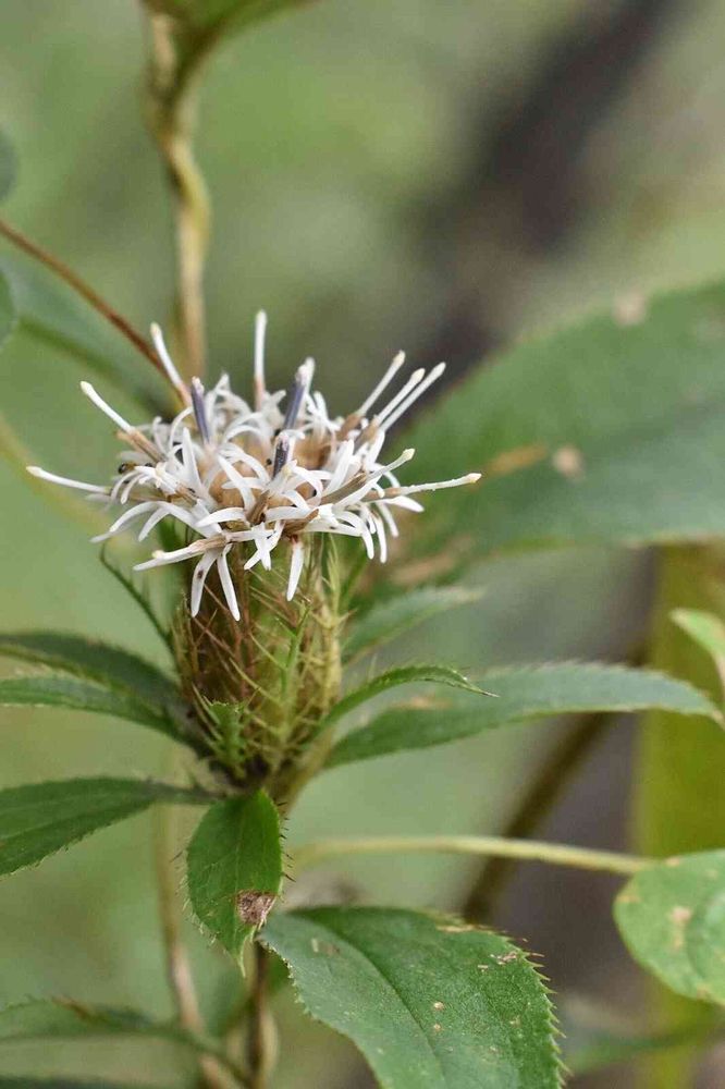 雌雄異株。雌花と両性花がある。頭花は枝に頂生し、基部は魚骨状の苞が囲んでいる。総苞は鐘形。花冠は帯白色。冠毛は褐色を帯びる。