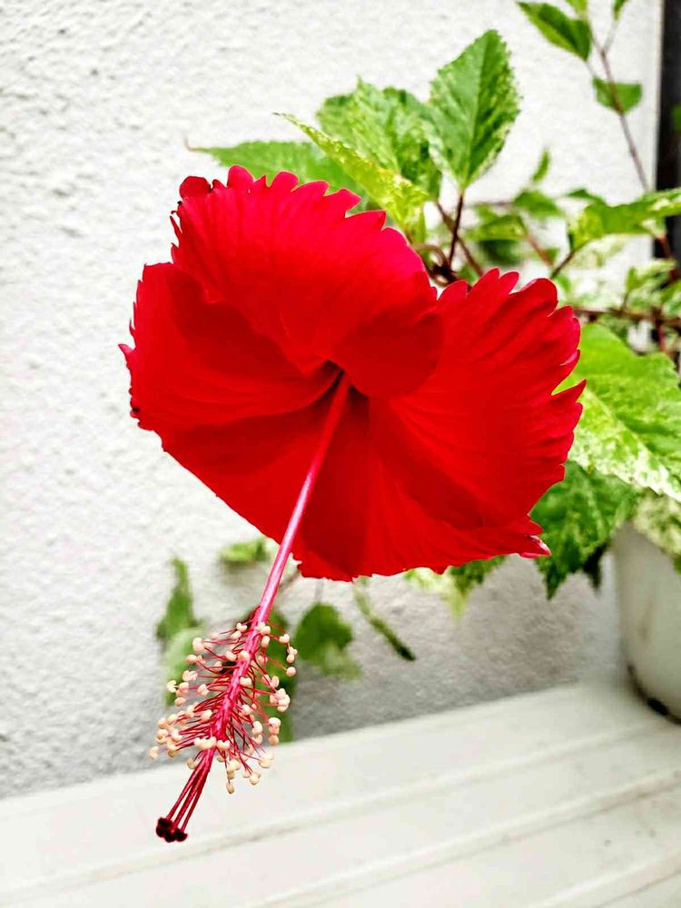さん、うちのフラミンゴさんと良く似た少し朱色がかった赤‼️咲くとパッと目を引きます‼️でも、こちらは広がるのよ~💦なので下に置いておくと地面についてしまうので😅ここは室外機の上です。他のハイビスカスは上にヒョロリと伸びるタイプだけど、これは広がるタイプ。