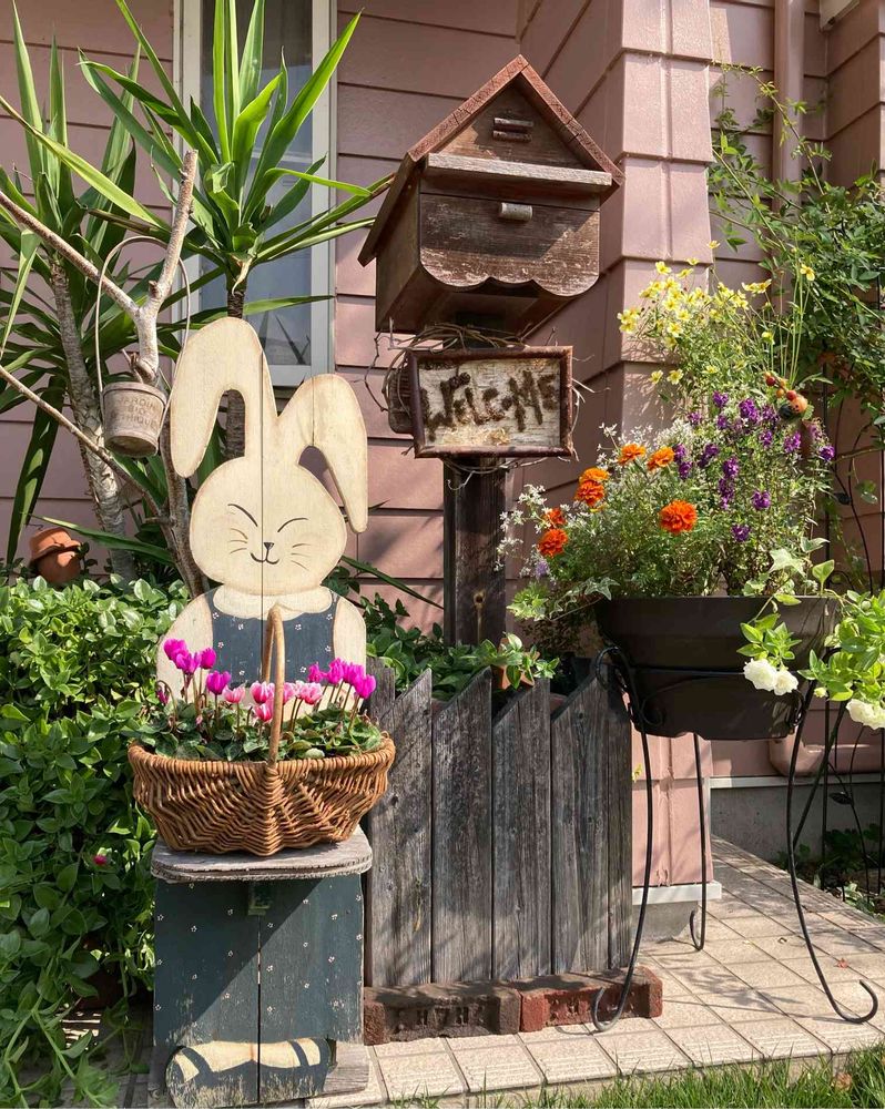 うさちゃん🐰は可愛いしカゴにシクラメンが合ってるしカントリー風で理想的な