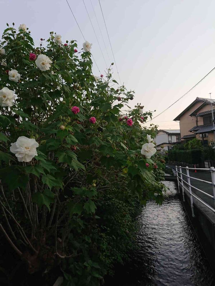 うちの近くの用水路です。朝早かったので、水面が暗いです。橋があって、橋の手前のお家の酔芙蓉が次々と花を咲かせています。